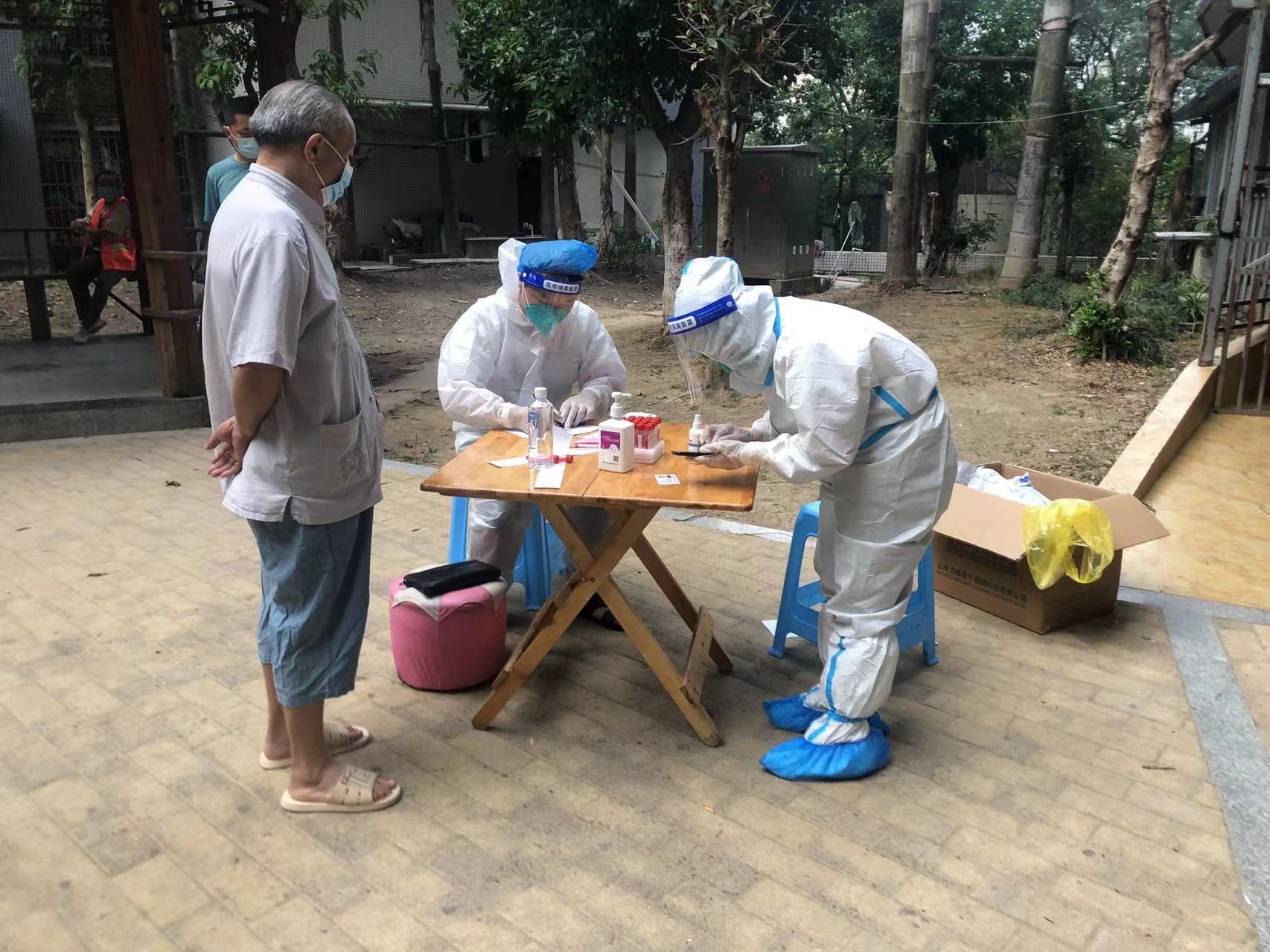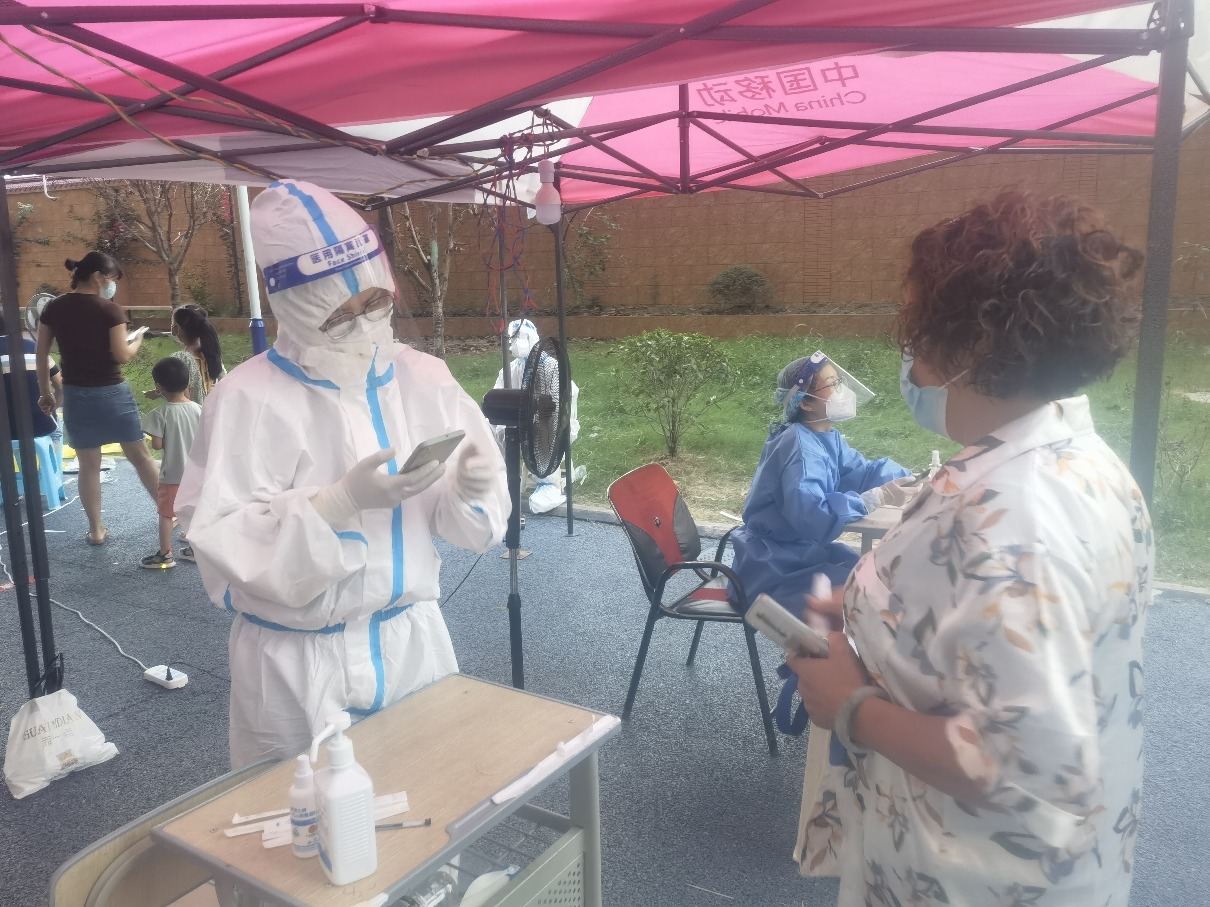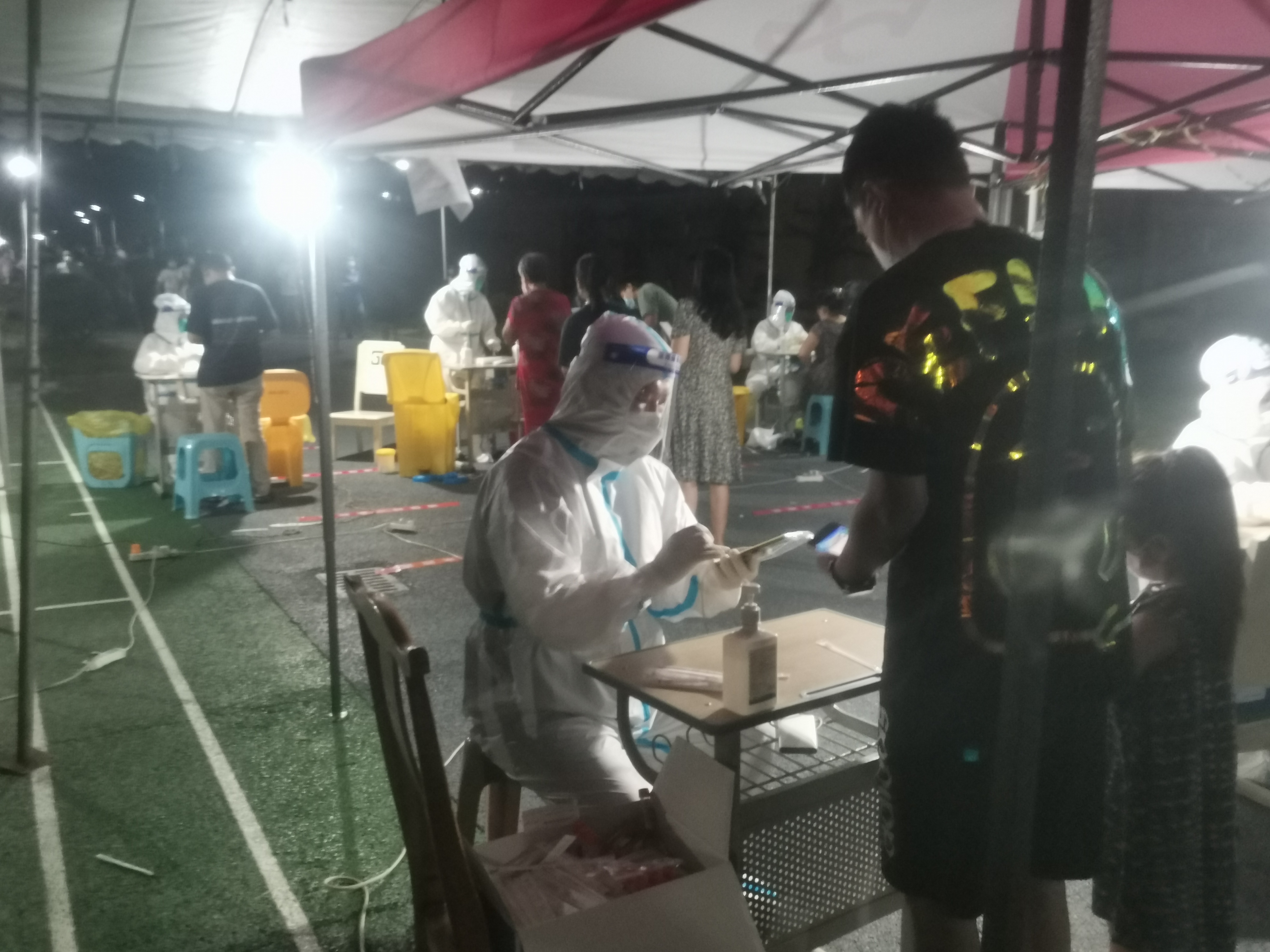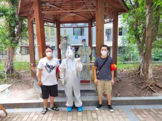 由于疫情来得突然,社区初期抗疫物资不足,他就自备防护措施参与疫情防控。初秋的天气依旧带着七八分闷热,长时间坚守在核酸检测岗位上,腿脚酸麻不说,最难受的是汗水涔涔而出,不一会就打湿了衣服和口罩。他说:“整个人仿佛是在蒸笼里呆着,气温高的时候连呼吸都觉得困难,每次回家后衣服都拧得出水,现在终于知道了医务工作者有多不容易...”9月12日,他因长期高温作战而出现中暑症状,紧急服药休息后,又马不停蹄重返岗位。